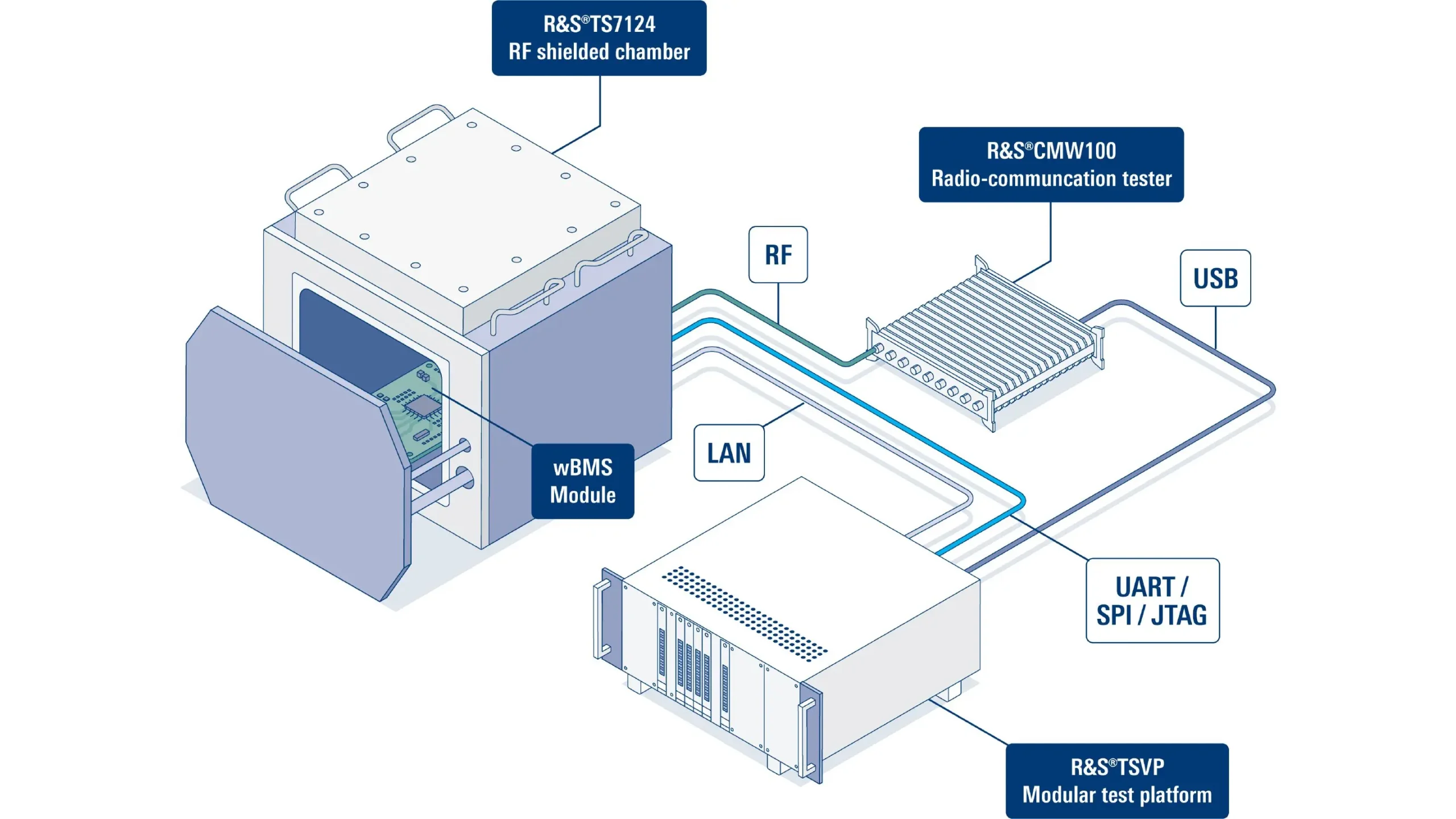 Rohde & Schwarz hat zusammen mit Analog Devices ein Testsystem für drahtlose Batteriemanagementsysteme (Wireless Battery Management Systems, wBMS), entwickelt. Mit diesem Testaufbau können die notwendige wBMS-Modul-Kalibrierung sowie Empfänger-, Sender- und DC-Tests schnell und zuverlässig durchgeführt werden – zur Verifizierung im Labor oder für Produktionstests mit hoher Ausbeute. Er besteht aus dem R&S CMW100 Radio Communication Tester, dem R&S WMT Wireless Automated Testing Software Framework, und der neuen R&S ExpressTSVP Universal Test and Measurement Platform. Für gestrahlte Tests wird der Prüfling (DUT) in einer störungsfreien Umgebung platziert, z.B. in der R&S TS7124 HF-Schirmkammer. (oe)