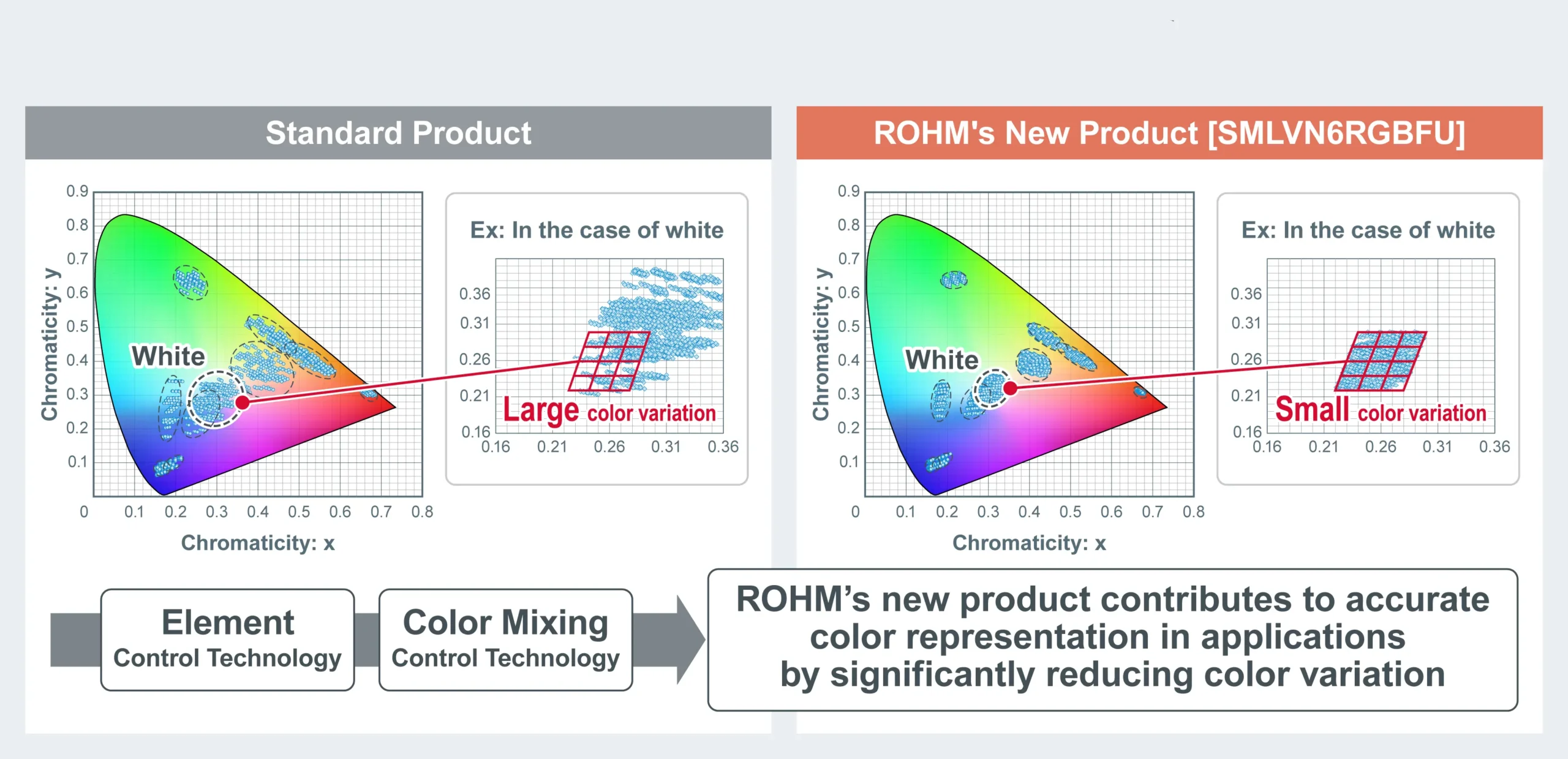 Üblicherweise sind bei RGB-Chip-LEDs, die Licht in einer bestimmten Farbe emittieren sollen, eine präzise und individuelle Steuerung der Wellenlänge und der Helligkeit der einzelnen RGB-Leuchtelemente sowie Methoden zur Verbesserung der Farbmischfähigkeit erforderlich. ROHM hat die Farbabweichung der Elemente dagegen im Vergleich zu üblichen Produkten verringert, indem es ein vertikal integriertes Produktionssystem ab der Herstellung der Elemente verwendet. Gleichzeitig reduziert die eingesetzte Technik zur Steuerung der Farbmischung die Farbabweichungen. (jr)
