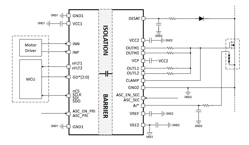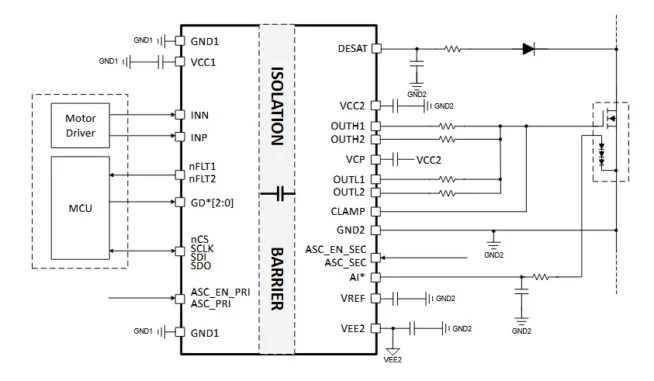 Der Baustein verfügt über Schutzfunktionen für Leistungstransistoren wie Überstrom auf Shunt-Widerstandsbasis, Übertemperatur (PTC, NTC oder Diode) und Desatuierungserkennung (DESAT).