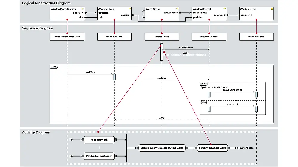 Das Sequenzdiagramm ist nahtlos ins Datenmodell integriert, sodass Interaktionen für Software- und Hardwarekomponenten auf verschiedenen Abstraktionsebenen erstellt werden können. Nachrichten zwischen Objekten und Interaktionsfragmente lassen sich flexibel modellieren. Ein technisches Beispiel veranschaulicht die Nutzung der neuen Funktionen.