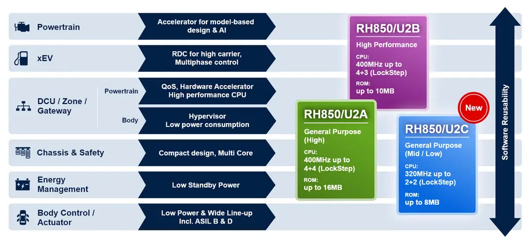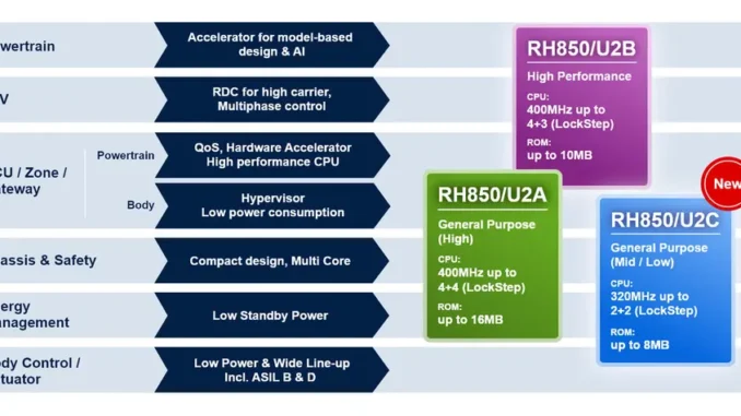 Renesas Electronics erweitert sein RH850-Portfolio um die Low-End-Variante RH850/U2C. Der Mikrocontroller integriert bis zu vier RH850-CPU-Kerne mit Taktfrequenzen von bis zu 320 MHz, wobei jeweils zwei Kerne im Lockstep-Modus betrieben werden können. Der On-Chip-Flash-Speicher umfasst bis zu 8 MB. Anwender bestehender RH850/P1x- und RH850/F1x-Baureihen können ohne grundlegende Architekturänderungen auf den RH850/U2C migrieren.