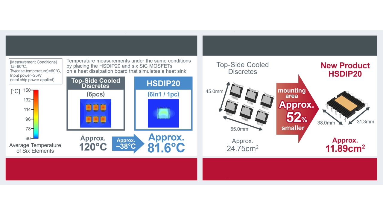 Das HSDIP20-Gehäuse verfügt über ein isolierendes Substrat mit wärmeableitenden Eigenschaften, das den Temperaturanstieg des Chips auch bei hoher Leistung reduziert. Beim Vergleich einer typischen OBC-PFC-Schaltung mit sechs diskreten SiC-MOSFETs mit Wärmeableitung auf der Oberseite mit dem 6-in-1-Modul von ROHM wurde festgestellt, dass das HSDIP20-Gehäuse unter gleichen Bedingungen um ca. 38 °C kühler ist (bei 25-W-Betrieb). Die damit erreichbare Leistungsdichte ist nach Herstellerangaben mehr als dreimal so hoch wie bei oberflächengekühlten diskreten Modulen und mehr als 1,4 mal so hoch wie bei vergleichbaren DIP-Modulen. Damit reduziert das HSDIP20 in der oben genannten PFC-Schaltung den Platzbedarf um rund 52 Prozent gegenüber oberflächengekühlten diskreten Konfigurationen und leistet damit einen wichtigen Beitrag zur Verkleinerung von Leistungswandlerschaltungen in Anwendungen wie OBCs. (jr)