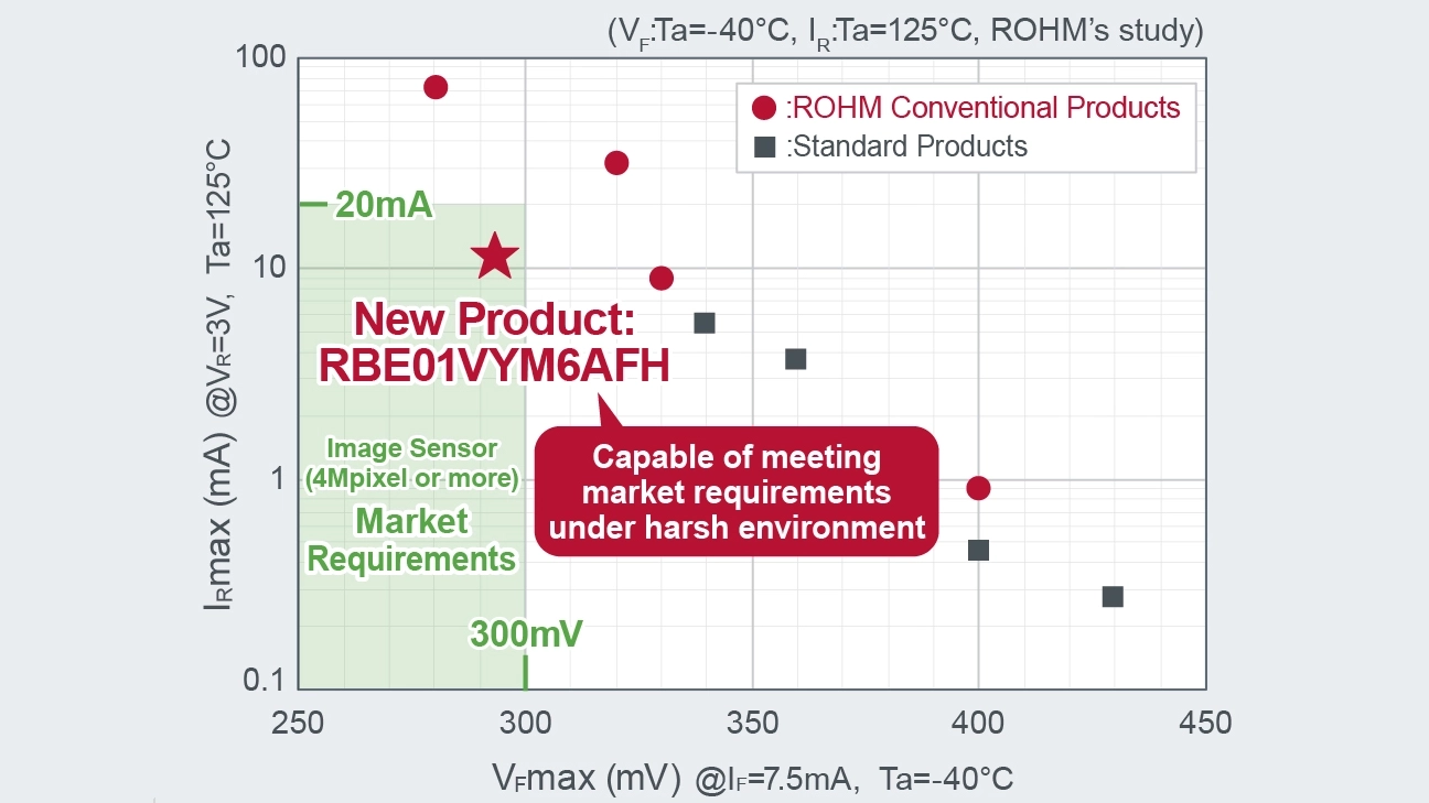 Die Schottky-Barrier-Diode (SBD) RBE01VYM6AFH hat Rohm für den Schutz von hochauflösenden Bildsensoren entwickelt. Durch den Einsatz einer proprietären Architektur ist es dem Unternehmen gelungen, einen niedrigem Sperrstrom IR zu erreichen – ein Wert, der bei Designs mit niedriger Durchlassspannung VF normalerweise nur schwer zu realisieren ist. Mit einem VF von weniger als 300 mV (bei IF = 7,5 mA, selbst bei Ta = –40 °C) und einem IR von weniger als 20 mA (bei VR = 3 V, selbst bei Ta = 125 °C) erfüllt das Bauelement auch unter rauen Umgebungsbedingungen die Anwendungsanforderungen. Diese Eigenschaften verhindern nicht nur Schäden an der Schaltung durch hohe Photovoltaik-Spannungen, die bei ausgeschaltetem Zustand unter Lichtexposition in hochauflösenden Bildsensoren entstehen können, sondern verringern auch das Risiko von thermischem Durchgehen und Fehlfunktionen während des Betriebs erheblich.