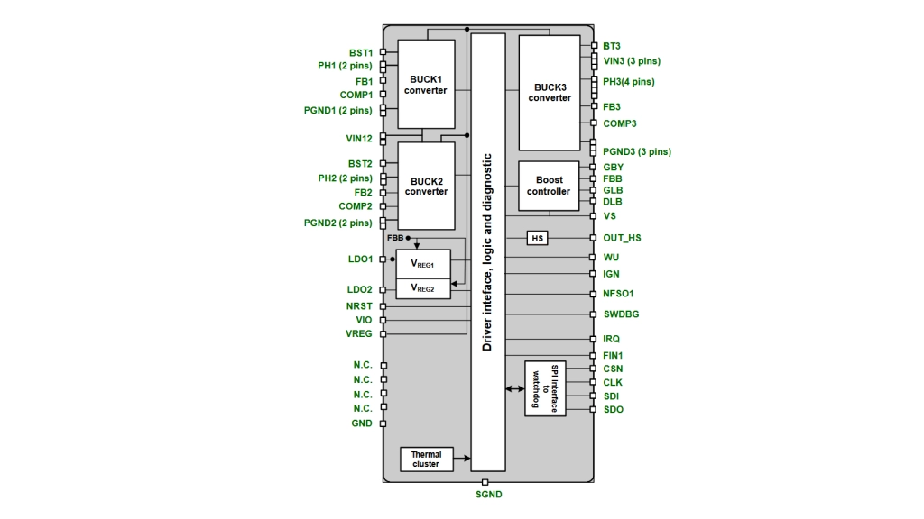 Mit seinen drei getakteten Abwärtswandlern und seinen zwei linearen Spannungsreglern (LDOs) liefert der PMIC SPSB100 von STMicroelectronics nicht nur die nötigen Versorgungsspannungen für den System-Mikrocontroller, sondern kann auch externe Peripheriefunktionen und Sensoren speisen. Geboten werden überdies zwei Wake-up-Eingänge und ausgefeilte Failsafe-Funktionen. Ein eingebauter Aufwärtsregler stabilisiert die Stromversorgung bei transienten Zuständen wie etwa beim Kaltstart oder im Start/Stopp-Betrieb sowie bei schwacher Batterie.