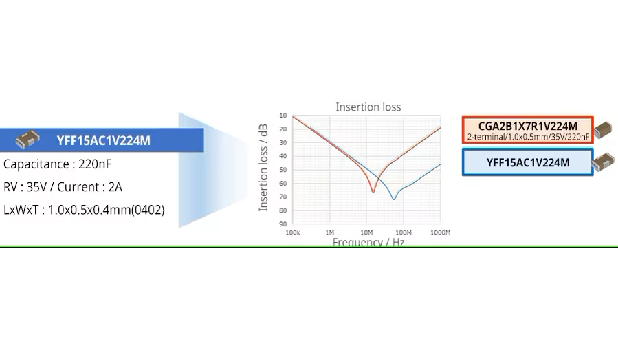 Dank einer optimierten Materialauswahl und eines neu gestalteten Produktentstehungsprozesses zeichnen sich die Produkte der Serie durch eine deutlich höhere Spannungsfestigkeit von 6,3 V bis 35 V sowie eine wesentlich höhere Kapazität von 0,47 µF bis 4,7 µF aus. Das 35-V-Produkt mit einer Einfügedämpfung von 40 dB (4 MHz bis 2 GHz) kann für einen breiteren Bereich von Versorgungsleitungen verwendet werden, einschließlich der Ein- und Ausgänge von Stromversorgungssystemen. Das 4,7-µF-Produkt mit einer Einfügedämpfung von 30 dB (300 kHz bis 3 GHz) reduziert dagegen effektiver als herkömmliche Eingangskondensatoren Spannungsschwankungen und wirkt hochfrequentem Rauschen entgegen. Darüber hinaus lässt sich je nach Einsatzbedingungen die Anzahl der zur Unterdrückung von Spannungsschwankungen erforderlichen Bauelemente gegenüber MLCCs halbieren.
