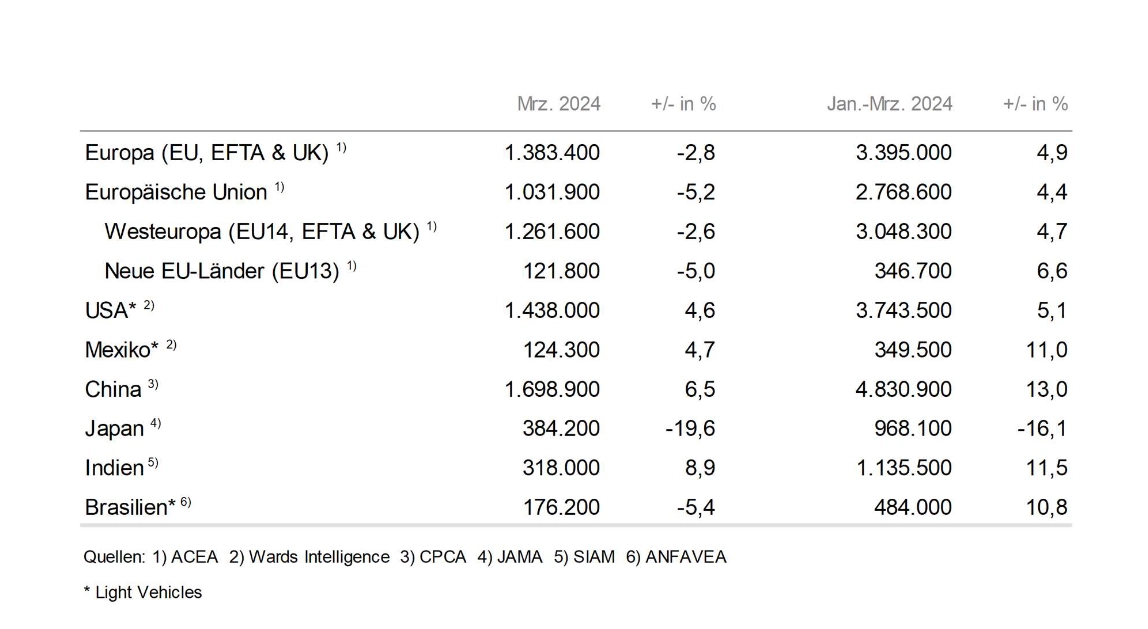 In China schlägt sich die gesamtwirtschaftlich herausfordernde Situation bis dato noch nicht negativ auf den Pkw-Absatz nieder: Auf dem chinesischen Pkw-Markt wurden im ersten Quartal 4,8 Mio. Neufahrzeuge verkauft, 13 % mehr als im Vorjahr. Im März wurden knapp 1,7 Mio. Einheiten abgesetzt, 7 % mehr als im Vorjahresmonat.