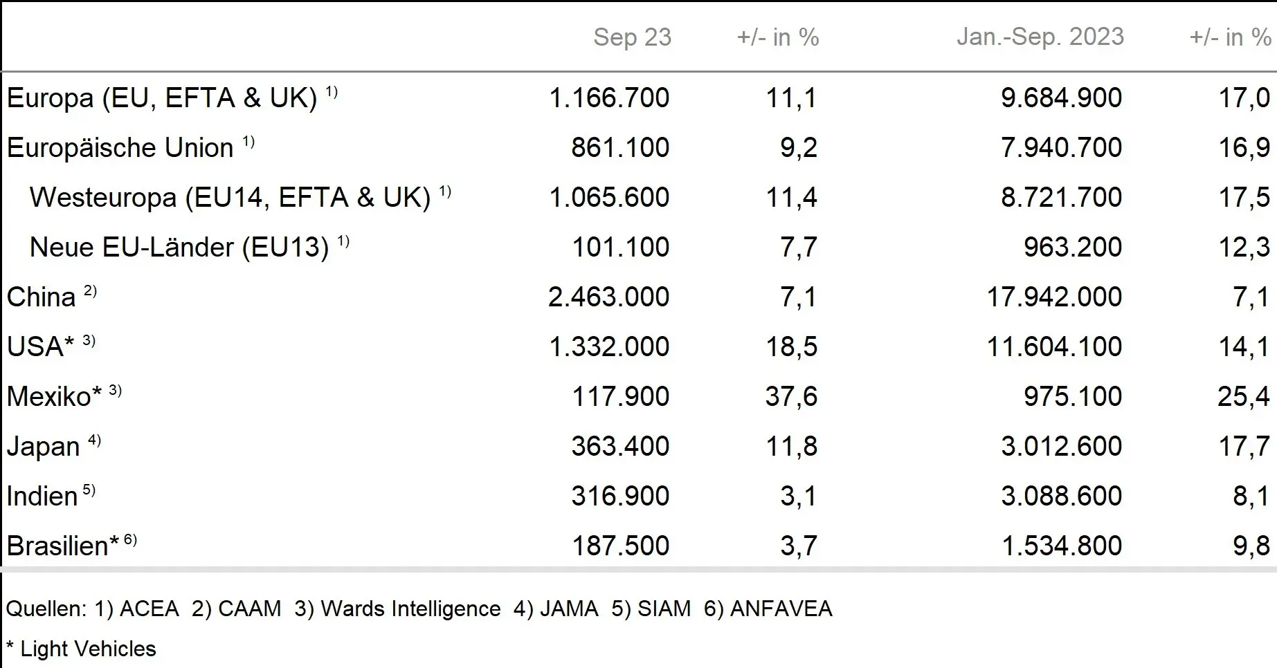 Der Absatz vin Light-Vehicles in Mexiko ist in den ersten neun Monaten des Jahres 2023 deutlich gestiegen und liegt damit bereits wieder 2 % oberhalb dem vom Vergleichszeitraum 2019.