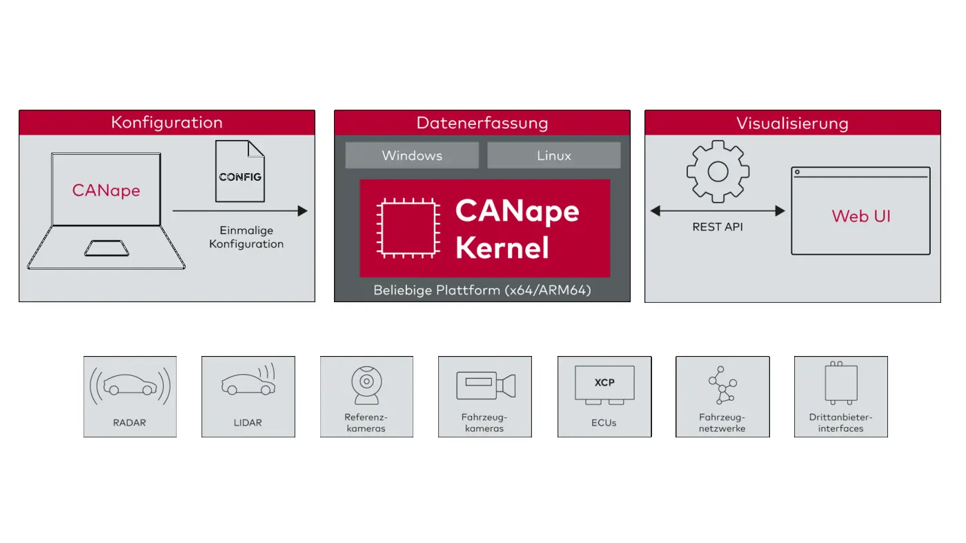Der CANape Kernel ist als schlanke Konsolenanwendung konzipiert und ermöglicht schnelle Startzeiten bei geringem Ressourcenbedarf. Er eignet sich insbesondere für automatisierte Logging-Anwendungen, etwa im Umfeld von ADAS-Sensorik, Fahrzeugnetzwerken und softwaredefinierten Fahrzeugarchitekturen.