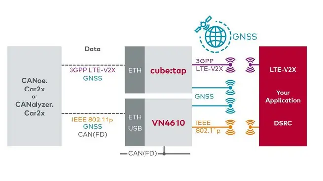 Das cube:tap Interface von Vector Informatik ermöglicht das Senden und Empfangen von 3GPP-LTE-V2X-(PC5)-Frames und unterstützt damit die Entwicklung und Validierung von Car2X- und V2X-Anwendungen. Der integrierte GNSS-Empfänger liefert präzise Zeit- und Positionsinformationen, die über UTC-Zeitstempel synchronisiert werden. In Verbindung mit CANoe und CANalyzer.Car2x ist die Hardware speziell auf Test- und Analyseaufgaben abgestimmt und trägt dazu bei, LTE-V2X-basierte Steuergeräte bis zur Serienreife zu bringen.