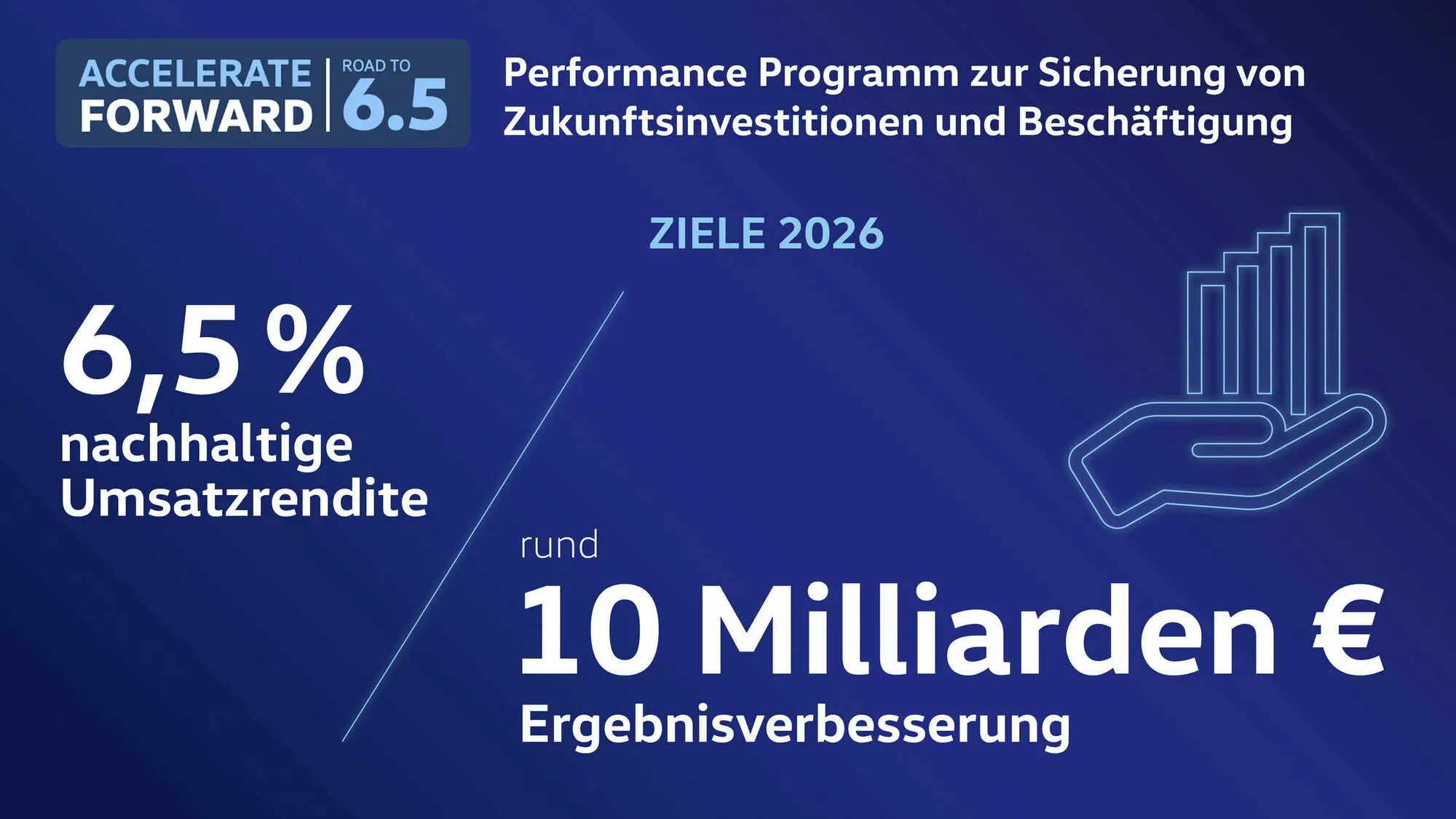 Volkswagen will mit Accelerate Forward bis 2026 eine Umsatzrendite von 6,5 Prozent erreichen. Dafür plant die Marke u.a., Verwaltungsabläufe zu entschlacken und zu beschleunigen, Effizienz in Entwicklung und Produktion zu erhöhen, die Modellpalette zu straffen und gleichzeitig Ausstattungsvarianten zu reduzieren sowie die Produktqualität weiter zu steigern. Diese Maßnahmen sollen innerhalb von drei Jahren zu einem um 10 Mrd. € verbesserten Ergebnis führen. (jr)
