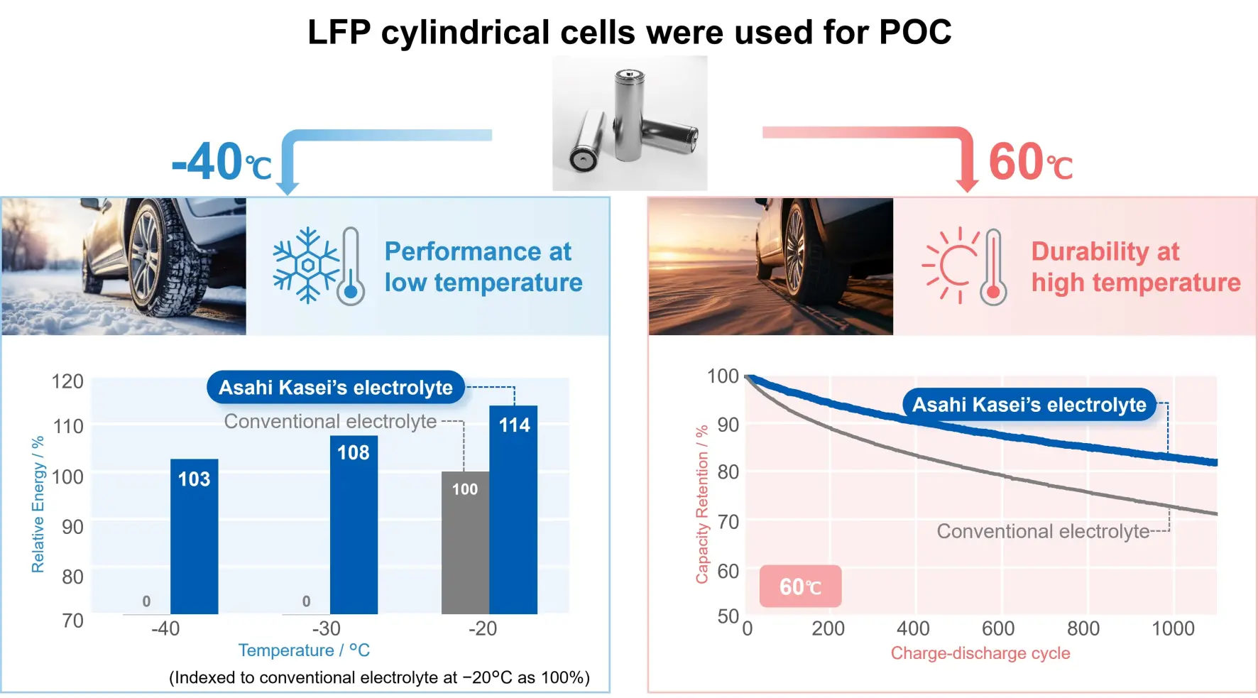 Das japanische Technologieunternehmen Asahi Kasei hat einen erfolgreichen Konzeptnachweis für Lithium-Ionen-Batterien mit einem neuartigen Elektrolyten mit hoher ionischer Leitfähigkeit erzielt. Damit können Batterien eine höhere Leistung bei niedrigen Temperaturen und eine verbesserte Lebensdauer bei hohen Temperaturen erreichen. Kompaktere Batteriezellen und reduzierte Kosten durch Materialeinsparungen sind weitere Vorteile. Bereits 2010 begann das Unternehmen mit der Entwicklung eines Elektrolyten mit besonders hoher ionischer Leitfähigkeit unter Verwendung von Acetonitril. Die hohe Ionenleitfähigkeit ermöglicht es, die Größe der Batteriepacks zu verringern und gleichzeitig die Leistung beizubehalten, was zu einer höheren Energiedichte der Batterie und niedrigeren Kosten des Batteriepacks beiträgt.