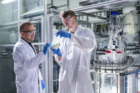 Daher beschloss Büchele Preußisch Weiß selbst zu synthetisieren. Bei diesen Arbeiten entstand am KIT nicht nur ein hochwertiges Kathodenmaterial, sondern auch ein innovatives Verfahren für dessen Herstellung. Mit dem Ziel, einen größeren Markt zu bedienen, gründete er gemeinsam mit dem Chemiker Tom Bötticher das Start-up Litona. „Bei Wettbewerbern gab es Probleme bei der Skalierung der Produktion von Preußisch-Weiß-Analoga“, sagt Büchele. „Wir glauben, dass wir diese gelöst haben. Außerdem haben wir Methoden entwickelt, um unser Material weiter aufzuwerten.“