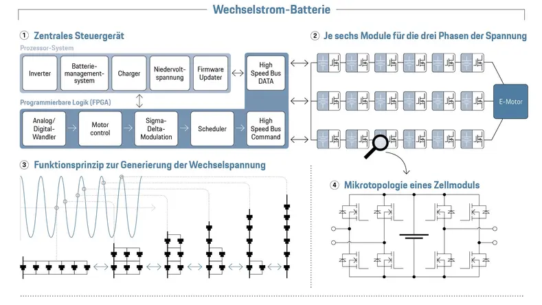 Porsche Engineering hat im Rahmen einer Machbarkeitsstudie ein neuartiges Batteriesystem für Elektrofahrzeuge entwickelt, das Gleichspannung direkt in dreiphasige Wechselspannung umwandeln kann. Herzstück ist ein modularer Multilevel-Inverter (MMSPC), der die Funktionen von Batteriemanagementsystem, Wechselrichter und On-Board-Lader in einem Bauteil vereint.